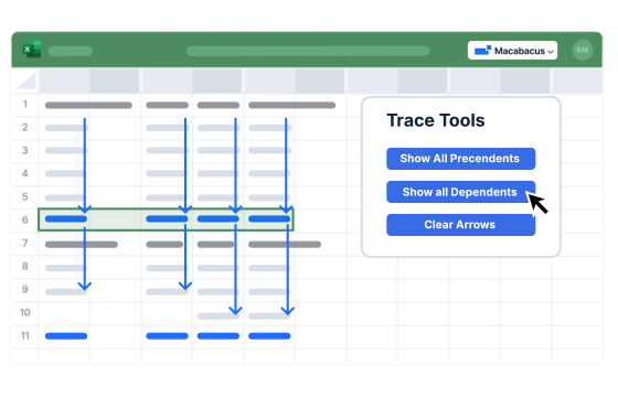 Trace precedents and dependents with advanced tracing tools. Instantly follow formula inputs, uncover formula dependencies, and Auto-trace entire logic chains with one click.